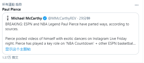皮尔斯遭解雇引热议,带脱衣舞娘回家太过分了;皮尔斯职业生涯效力过凯尔特人、篮网、奇才和快船,出战1343场常规赛,场均19.7分5.6篮板3.5助攻1.3抢断0.55盖帽,10次入选全明星、4次最佳阵容以及1次总冠军和1次FMVP,一冠奠定历史地位,可如今,皮尔斯的疯狂操作惹事了。