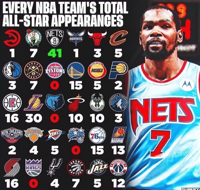 勇士和费城都是15次,他们队内也都有联盟的超级球星,水花兄弟、恩比德和本-西蒙斯等等都是全明星的常客。太阳13次,这其中就是保罗的11次和布克的2次,其中布克这两次都是以递补的身份进入的。