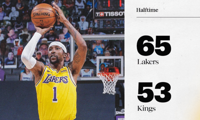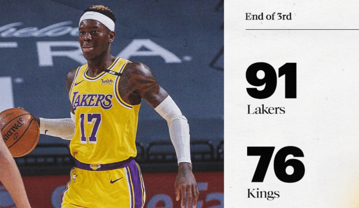 进入第三节,湖人依旧延续高效的三分火力,库兹马单节命中2记三分独得10分,施罗德同样也命中2记三分!三节打完,紫金军团将优势扩大到15分!而末节,湖人越打越顺,库兹马进入不可阻挡的模式,单节再次得分上双!直接把比赛打花了!最终湖人客场115比94大胜国王!给7连客开了一个好头!