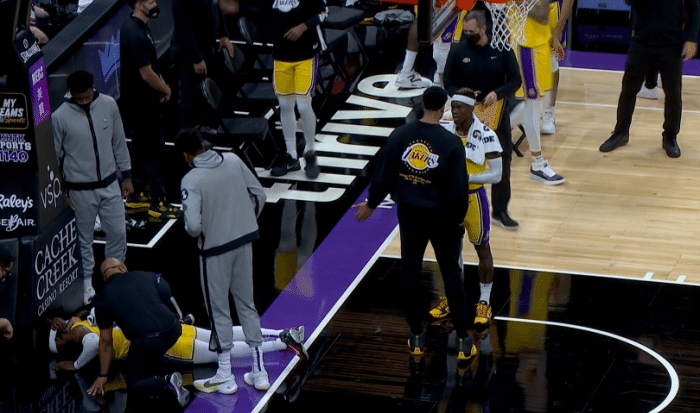 24直播网4月3日讯 湖人和国王比赛中,悍将马修斯意外受伤离场,脖子撞到场边的篮球架,趴在地板上很长时间才站起来,一直捂着自己的脖子,然后施罗德扶着马修斯返回更衣室;詹姆斯、浓眉和庄神三巨头都在养伤,湖人又伤一名轮换球员,伤病不断太不幸了。
