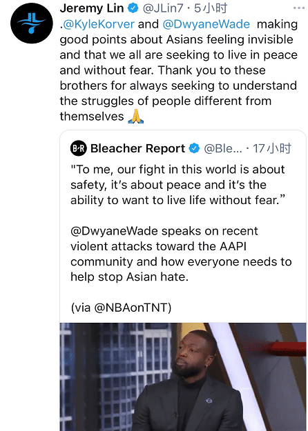 很快林书豪的事情就吸引了很多人的关注,尤其是NBA的领域,包括詹姆斯、韦德等人都在隔空喊话,声援亚裔,林书豪也在社交媒体上进行转发,感谢韦德和科沃尔等人为亚裔发声。