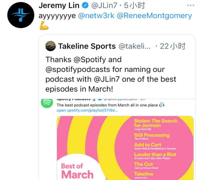 同时林书豪在场外也有收获,他在3月份做客《Takeline》的节目被评选为三月最佳节目,那一期节目探讨的针对亚裔的歧视和暴力的言论,收视率和影响力还是很高的,所以被选为了当月最佳节目。