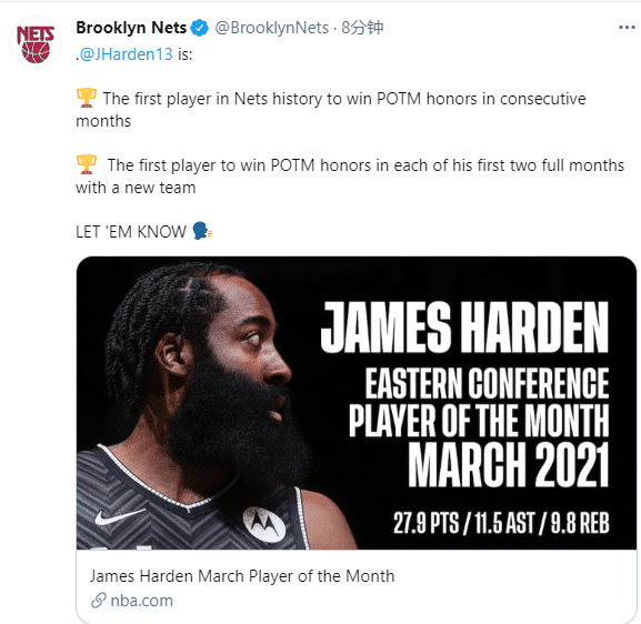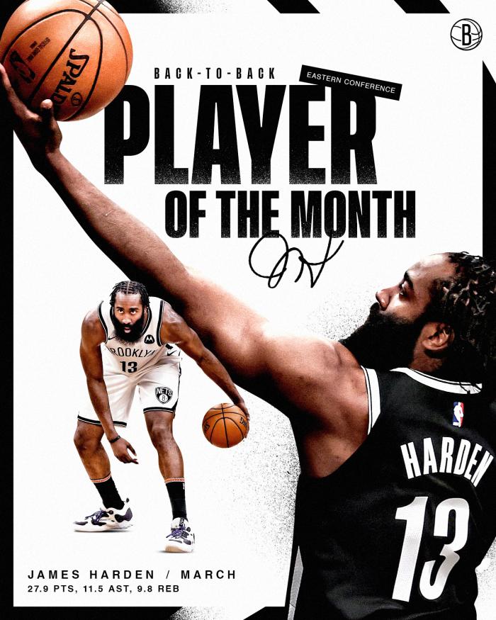 哈登带领篮网豪取11胜1负的出色战绩,场均上场38.8分钟能够砍下27.9分9.8篮板11.5助攻,本赛季第二次当选东部月最佳,也是连续两个月当选东部月最佳;哈登创纪录,成为篮网队史第一位连续两个月当选月最佳的球员,也成为NBA历史第一位在新球队头两个月都获得月最佳的球员。