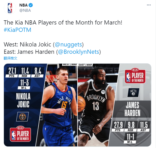 24直播网讯 NBA官方正式公布三月月最佳球员,西部约基奇和东部哈登荣誉当选,哈登连续两个月当选东部最佳创纪录;三月月最佳新秀也出炉。
