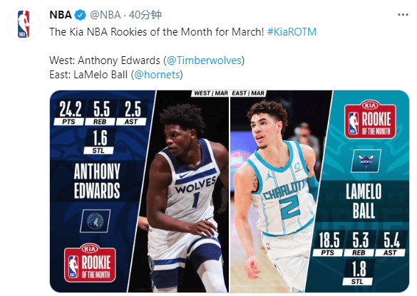 NBA官方公布了三月份的月最佳新秀,西部由森林狼的爱德华兹获得,东部则由黄蜂的拉梅洛-鲍尔获得。