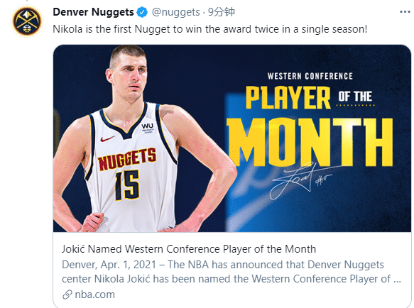 整个三月份,约基奇带领掘金拿到11胜3负的战绩,场均上场35.1分钟能够轰下27.1分11.4篮板8.4助攻;本赛季第二次当选月最佳,生涯第10次当选西部月最佳;约基奇成为掘金队史首次单赛季两次获得月最佳的球员;掘金官方恭喜约基奇获奖。