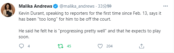 本赛季杜兰特仅仅为篮网出战19场比赛,缺席场次达到30场(算上今天的比赛),场均上场35.7分钟能够轰下29分7.3篮板5.3助攻还有1.4盖帽0.7抢断,但愿杜兰特早日痊愈,死神又快回来了。