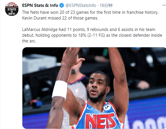 据美媒ESPN Stats&Info统计,篮网最近23战豪取20胜3负,队史首次在23场拿到如此豪华的战绩;杜兰特仅仅只打了其中的一场比赛——2月14日对阵勇士,杜兰特出战33分钟拿到20分5篮板6助攻,然后杜兰特便因腿筋拉伤缺席至今。