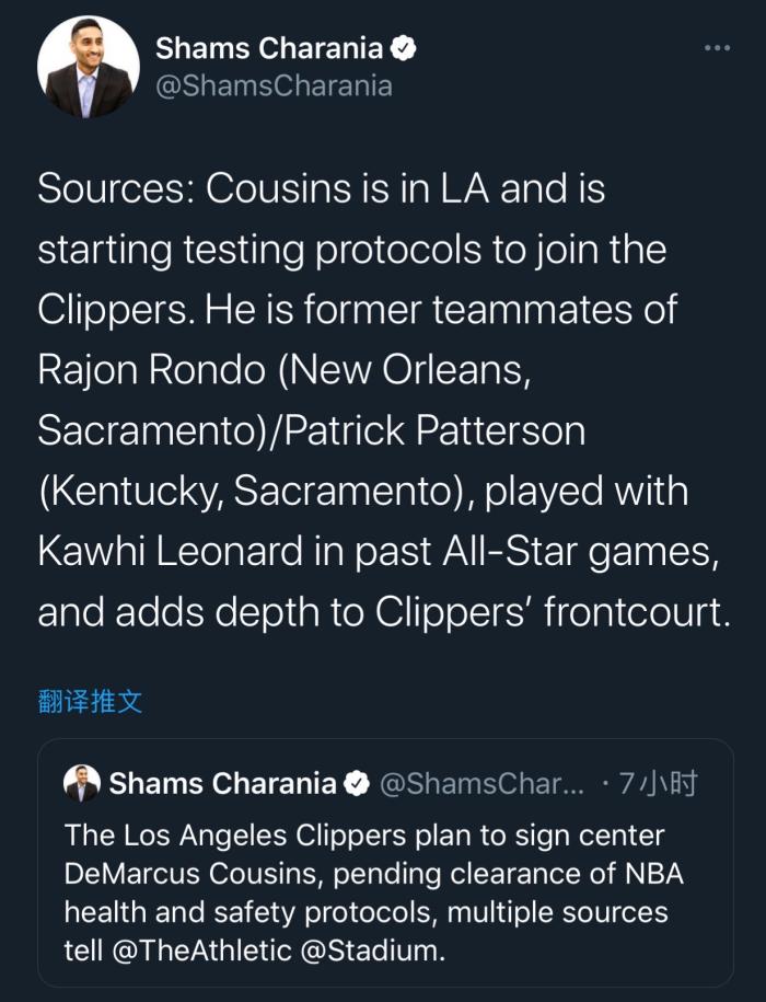 24直播网讯北京时间2021年4月1日星期四凌晨,根据知名媒体人Adrian Wojnarowski和Shams Charania的报道,本赛季曾效力于休斯顿火箭队的前全明星中锋德马库斯-考辛斯,与洛杉矶快船队达成一份十天合同!