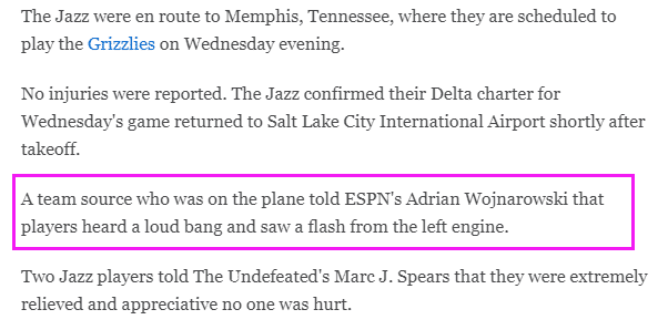 飞机安全降落在盐湖城,现场画面曝光,机头上有裂痕而且有血迹,引擎则是严重损坏并且停止运转;据ESPN名记沃纳罗斯基报道,飞机遭遇意外时,球员们听到一声巨响,看到左引擎发出闪光;爵士包机因飞行起飞时撞到一群飞鸟导致引擎故障,所幸顺利降落,全队没有人受伤。