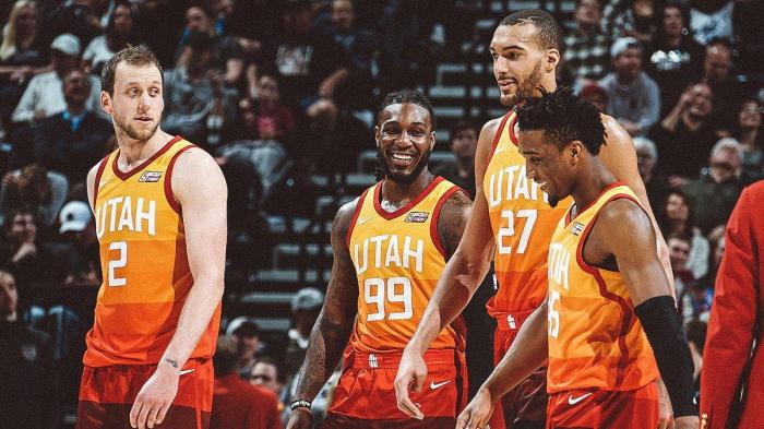目前爵士35胜11负排在西部第一,又豪取一波6连胜稳坐联盟第一宝座,场均117分联盟第三,三分出手数和命中数都领跑联盟,场均失分107.5分联盟第四,攻防两端都是联盟顶级的;米切尔是爵士头牌球星,场均25.7分队内第一,全队6人场均得分上双。