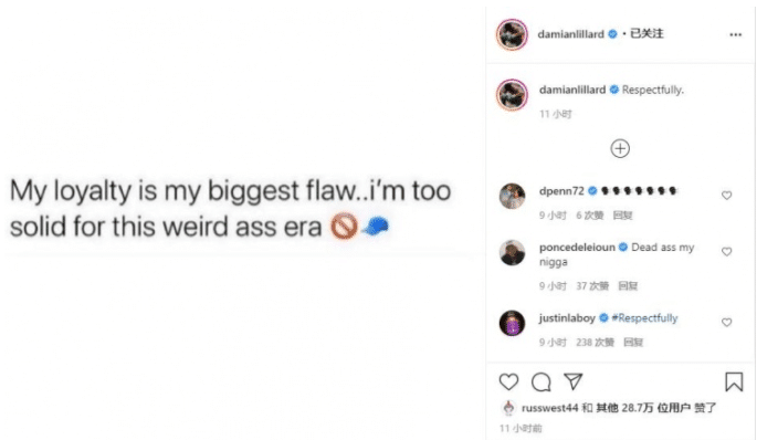 利拉德今天更新社交媒体,他晒出了一张白底图片,上面的文字写的是“忠诚是我最大的弱点,在这个荒诞的时代我过于坚定了。”