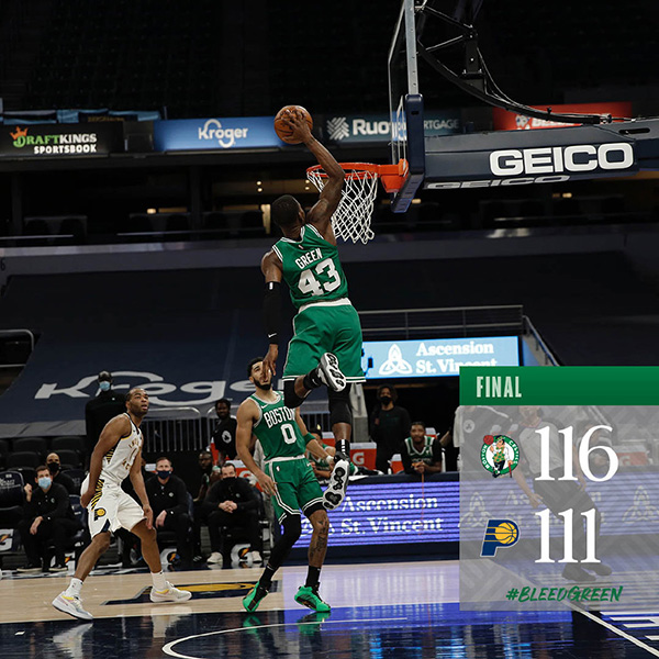 末节,凯尔特人上来塔图姆和格林连续得分,普里查德也连得5分,塔图姆切入上篮后凯尔特人打出11-0攻击波扳平比分,之后麦克康纳尔上篮得分,步行者才打破了得分荒。随后双方你来我往互不相让,比分一直无法拉开。关键时刻,又是塔图姆制造罚球全中,斯马特再中3分,单节绿军打出26-7攻击波,将差距扩大,之后塔图姆两罚中一,奥拉迪波上篮得分,比分差距来到2分。最后30秒,布朗和布罗格登相互得分,塔图姆也两罚全中,最后14.8秒,绿军领先4分。关键时刻,小萨博尼斯出现失误,斯马特两罚中一,帮助凯尔特人锁定胜局。