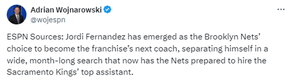 24直播网讯 北京时间4月16日,据名记Woj报道,国王助教霍尔迪-费尔南德斯将成为新任篮网主帅,篮网新帅现年41岁,曾与詹姆斯欧文共事过,去年夏天带领加拿大男篮击败美国队夺得世界杯铜牌。