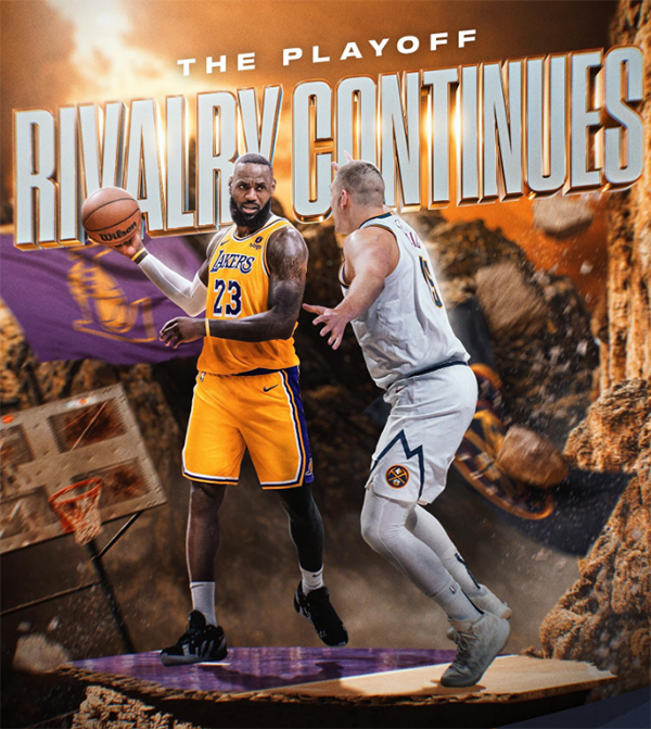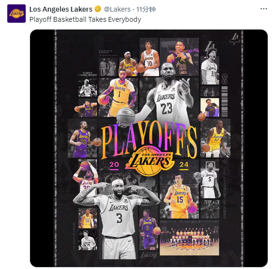 湖人官方海报庆祝晋级季后赛,詹姆斯和浓眉的位置体现他们的领袖地位。