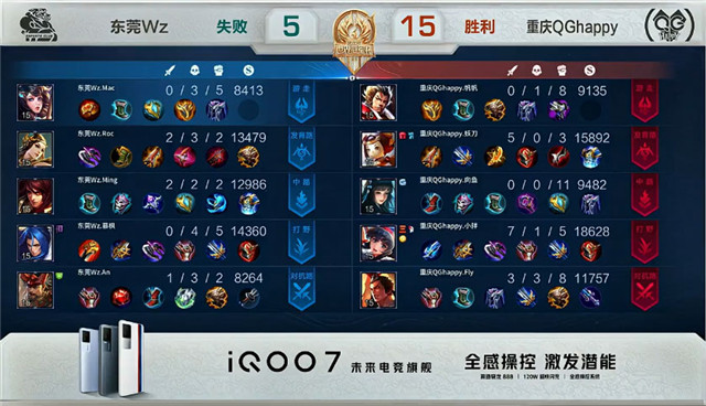 双方常规开局。51秒东莞Wz上路击杀猪八戒拿到一血。1分05秒东莞Wz拿下中路河道之灵。2分25秒重庆QG野区击杀兰陵王并拿下暴君。4分36秒重庆QG下路打出0换2。4分44秒重庆QG摧毁敌方下路外塔。5分05秒重庆QG摧毁敌方下路二塔。5分11秒重庆QG拿下主宰。6分18秒东莞Wz暴君处击杀镜。8分04秒双方上路游走互换,重庆QG摧毁敌方下路二塔。9分20秒重庆QG拿下主宰。10分11秒东莞Wz中路击杀猪八戒。12分17秒暴君处团战重庆QG打出1换3。13分16秒重庆QG中路击杀盾山并摧毁中路外塔。13分39秒重庆QG拿下暗影主宰。18分06秒重庆QG下路镜单杀兰陵王。16分31秒上路团战重庆QG摧毁敌方上路高地塔,东莞Wz打出1换5。17分28秒东莞Wz摧毁敌方水晶拿下比赛。
