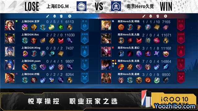 开局双方正常抢线。47秒野区南京Hero久竞击杀孙膑,拿下一血,打出2换1。2分41秒南京Hero久竞拿下暴君,上海EDG.M拿下主宰。5分41秒对抗路南京Hero久竞击杀曹操,摧毁敌方对抗路外塔。6分51秒南京Hero久竞摧毁敌方发育路外塔,上海EDG.M摧毁敌方中路外塔,击杀盾山,打出1换2,拿下主宰,摧毁敌方对抗路外塔,南京Hero久竞拿下暴君。8分53秒发育路上海EDG.M击杀铠,打出2换3。10分22秒野区上海EDG.M击杀铠,拿下暗影主宰,摧毁敌方对抗路二塔、发育路二塔。11分35秒上海EDG.M摧毁敌方发育路高地,击杀虞姬,曹操二连击破,打出0换4,摧毁水晶拿下比赛。