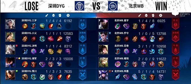 2分钟上路团战,鲁班大师拿下一血,马超拿下三杀。3分30秒阿古朵拿下暴君。4分10秒下路团战,兰陵王被击杀。4分30秒马超推掉上路一塔。5分21秒河道团战,深圳DYG打出0换2。5分50秒澜拿下主宰。6分20秒阿古朵拿下暴君。7分10秒河道团战,深圳DYG打出0换2。7分34秒虞姬推掉中路一塔。10分21秒暴君团,马超拿下双杀,澜拿下暴君。10分57秒马超拿下主宰。11分33秒狄仁杰推掉中路一塔。14分钟阿古朵拿下暴君。15分钟阿古朵拿下主宰。15分45秒狄仁杰推掉上路高地塔。17分钟阿古朵拿下暴君。18分27秒北京WB推掉中下两路高地塔,团战北京WB打出0换4。18分49秒北京WB推掉水晶率先拿下一分。