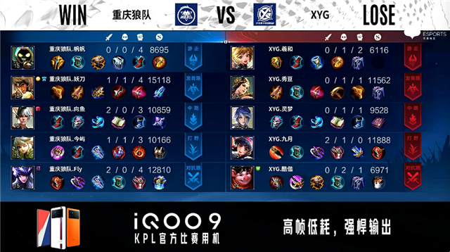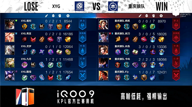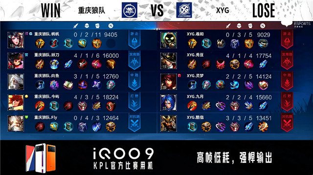 双方常规开局。1分39秒重庆狼队中路击杀吕布拿到一血。3分09秒XYG拿下暴君。4分58秒野区团战重庆狼队击杀澜。5分39秒XYG拿下主宰。7分20秒重庆狼队拿下暴君。8分26秒主宰处团战重庆狼队拿下1换3。10分48秒对抗路团战XYG打出0换3。11分28秒XYG拿下暗影主宰,重庆狼队拿下暗影暴君。12分58秒XYG摧毁敌方发育路二塔。14分51秒XYG中路打出0换3。16分35秒XYG拿下暗影暴君。19分02秒XYG拿下暗影主宰。19分38秒中路团战XYG打出1换5。19分54秒重庆狼队摧毁敌方水晶拿下比赛。