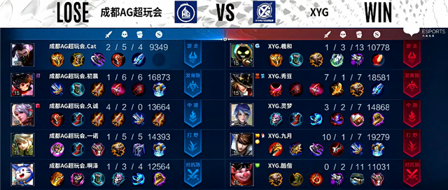 双方和平开局。3分40秒中路团战,马超拿下一血。4分钟阿古朵拿下暴君。4分12秒沈梦溪推掉上路一塔。5分20秒中路团战,双方1换1,虞姬推掉下路一塔。6分钟云缨拿下主宰。8分钟中路团战,双方1换1。9分30秒云缨拿下暴君。11分钟野区团战,双方2换2。13分钟河道团战,双方1换1。13分30秒李元芳推掉中路一塔。14分10秒虞姬拿下暴君。15分钟主宰团,双方1换1。16分27秒云缨拿下主宰。17分30秒野区团战,双方1换1,虞姬推掉中路一塔。18分28秒云缨拿下暴君。21分钟中路团战,XYG打出1换2。23分钟中路团战,成都AG超玩会打出2换5团灭XYG。23分47秒成都AG超玩会推掉水晶率先拿下一分。