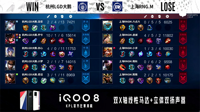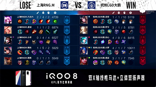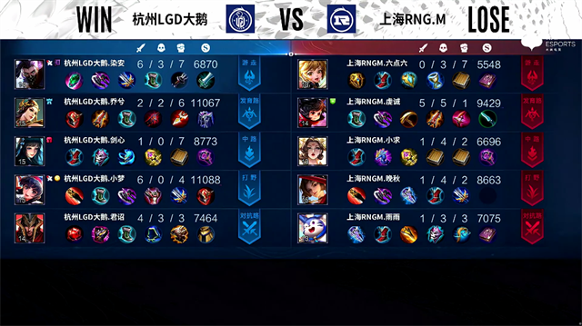 1分34秒,上路团,杭州LGD大鹅打出2换2,娜可露露拿下双杀。2分57秒,双方团战2换2。3分58秒,杭州LGD大鹅击杀李元芳。4分31秒,杭州LGD大鹅破掉上海RNG.M上一塔,随后控下先知主宰。5分52秒,杭州LGD大鹅击杀武则天,随后破掉上海RNG.M下二塔。6分41秒,杭州LGD大鹅控下暴君。7分13秒,杭州LGD大鹅击杀武则天。8分22秒,杭州LGD大鹅上路击杀梦奇。8分46秒,中路团,杭州LGD大鹅打出1换2。9分18秒,杭州LGD大鹅控下先知主宰。9分54秒,杭州LGD大鹅破掉上海RNG.M上二塔,双方团战1换1。10分52秒,杭州LGD大鹅虞姬击杀梦奇。11分20秒,杭州LGD大鹅破掉上海RNG.M下高地。12分30秒,杭州LGD大鹅击杀梦奇并破掉上海RNG.M上高地。12分50秒,杭州LGD大鹅控下暗影主宰。13分17秒,双方团战1换1。13分38秒,杭州LGD大鹅虞姬下路点掉上海RNG.M水晶赢下比赛。