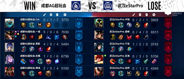 双方和平开局。1分45秒下路团战,裴擒虎拿下一血。2分25秒裴擒虎被击杀。3分05秒镜拿下暴君。4分25秒猪八戒被击杀。4分57秒镜拿下主宰。5分20秒成都AG超玩会下路一塔被破。5分50秒裴擒虎推掉上路一塔。6分25秒野区团战,蔡文姬被击杀。6分40秒上路团战,双方1换1。8分钟镜拿下暴君。9分12秒镜拿下主宰。9分30秒裴擒虎推掉下路二塔。10分钟上路团战,武汉eStarPro打出0换2。10分34秒镜拿下暴君。11分45秒中路团战,公孙离被击杀。12分钟裴擒虎拿下主宰。14分40秒公孙离拿下暴君。16分40秒镜拿下主宰。17分10秒公孙离推掉中路一塔。18分58秒镜拿下暴君。19分钟成都AG超玩会推掉上路高地塔。20分钟野区团战,武汉eStarPro打出1换3。20分25秒武汉eStarPro推掉中路高地塔,团战团灭成都AG超玩会。21分钟镜拿下风暴龙王。26分45秒镜拿下风暴龙王。28分14秒武汉eStarPro推掉水晶率先拿下一分。