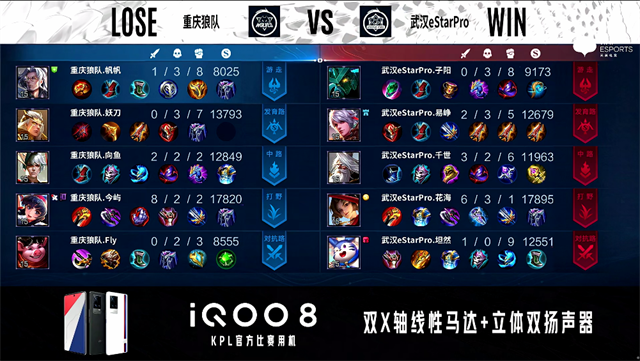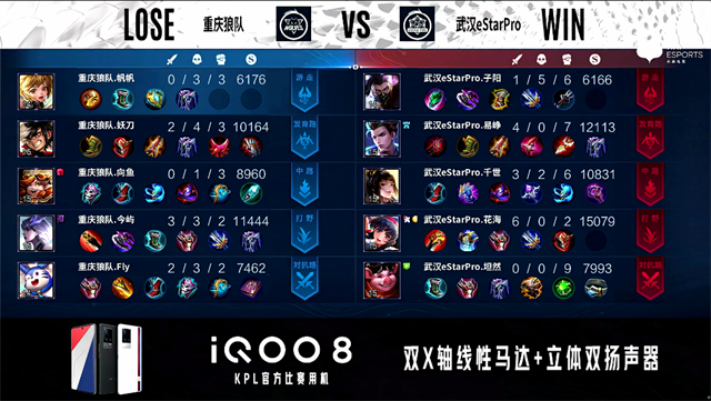 2分54秒,武汉eStar拿下暴君。3分45秒,下路团,重庆狼队打出0换2。4分40秒,重庆狼队破掉武汉eStar下一塔。5分18秒,武汉eStar拿下先知主宰。6分20秒,重庆狼队击杀云缨。6分50秒,重庆狼队破掉武汉eStar上一塔,武汉eStar击杀猪八戒。8分50秒,重庆狼队娜可露露击杀墨子。9分25秒,重庆狼队破掉武汉eStar上二塔。9分57秒,重庆狼队河道团战打出0换2。10分30秒,重庆狼队控下暗影暴君,随后团战打出1换2。12分10秒,武汉eStar百里守约击杀鲁班大师。12分45秒,武汉eStar控下暗影主宰。15分30秒,武汉eStar控下暗影暴君,随后击杀重庆狼队嬴政。15分58秒,武汉eStar破掉重庆狼队中一塔。16分14秒,武汉eStar先后破掉重庆狼队下二塔及下高地。17分04秒,武汉eStar控下暗影主宰。17分40秒,武汉eStar破掉重庆狼队上二塔。18分07秒,重庆狼队下路草丛蹲伏助队团战打出1换2。20分15 秒,武汉eStar姜子牙大闪击杀嬴政。20分40秒,武汉eStar控下风暴龙王,随后击杀猪八戒。21分10秒,武汉eStar破掉重庆狼队中、上两座高地。21分33秒,武汉eStar高地团打出0换4,随后一波摧毁重庆狼队水晶拿到赛点。