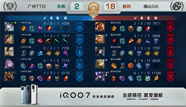 双方常规开局。1分08秒广州TTG拿下中路河道之灵。1分20秒佛山GK反掉敌方蓝BUFF。1分51秒佛山GK对抗路击杀东皇太一拿到一血。3分13秒佛山GK野区击杀露娜。3分59秒发育路团战佛山GK打出0换4。5分52秒佛山GK发育路击杀东皇太一。7分09秒双方中路1换1。7分25秒佛山GK拿下主宰。8分43秒佛山GK野区击杀东皇太一。8分58秒佛山GK摧毁敌方中路高地塔。9分23秒佛山GK拿下暴君。10分13秒广州TTG摧毁敌方对抗路二塔。10分27秒对抗路团战佛山GK打出1换3。10分59秒佛山GK拿下暗影主宰。11分54秒佛山GK发育路击杀东皇太一。12分04秒佛山GK摧毁敌方发育路高地塔。12分41秒佛山GK拿下暗影暴君。13分12秒对抗路团战佛山GK打出0换5。13分41秒佛山GK摧毁敌方水晶拿下比赛。