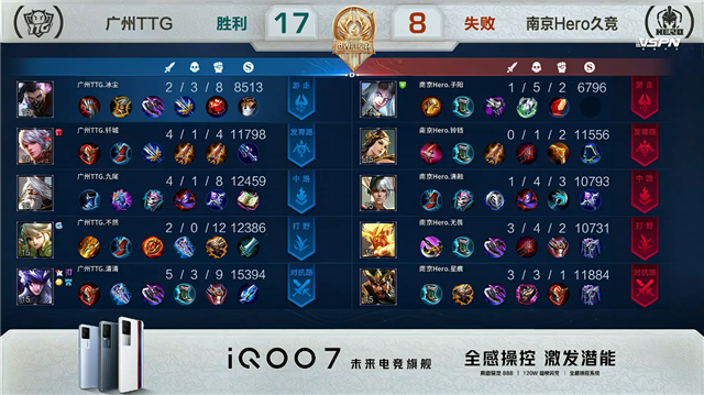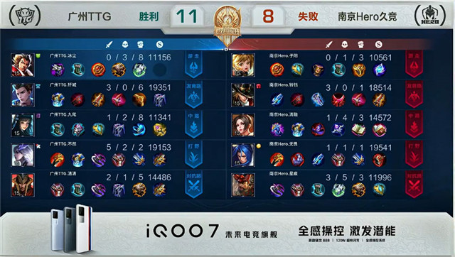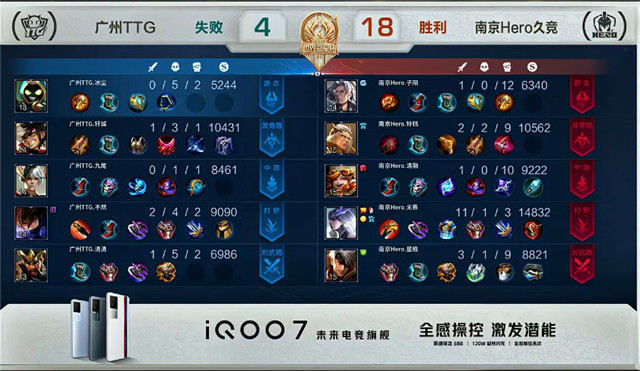 双方常规开局。1分07秒广州TTG拿下中路河道之灵。2分51秒双方暴君处1换1。3分09秒南京Hero发育路击杀蒙犽。3分33秒南京Hero拿下暴君。5分14秒南京Hero对抗路打出1换2。5分54秒南京Hero拿下主宰。7分44秒广州TTG对抗路击杀后羿。7分52秒南京Hero拿下暴君。8分28秒南京Hero中路击杀关羽。9分23秒野区团战南京Hero打出0换4。9分54秒南京Hero摧毁敌方对抗路高地塔。10分26秒广州TTG抢到暗影暴君,南京Hero击杀太乙真人。11分06秒南京Hero拿下暗影主宰。12分02秒野区团战南京Hero打出1换3。12分41秒南京Hero摧毁敌方中路高地塔。14分02秒高地团战南京Hero击杀关羽。14分18秒高地团战南京Hero击杀太乙真人。14分39秒南京Hero久竞团灭对手摧毁水晶拿下比赛。