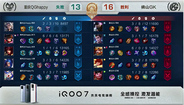 双方平稳开局。1分50秒上路团战,佛山GK打出1换2,兰陵王拿下一血。3分30秒裴擒虎拿下主宰,橘右京拿下暴君。4分钟下路团战,佛山GK推掉下路一塔,鲁班大师被击杀。5分20秒重庆QGhappy入侵野区,裴擒虎被击杀。5分30秒李元芳推掉下路一塔。6分20秒野区团战,重庆QGhappy打出1换2。7分钟,裴擒虎拿下主宰。7分30秒橘右京拿下暴君。9分10秒上路团战,佛山GK打出1换2。9分50秒河道团战,重庆QGhappy打出1换2。10分26秒橘右京被击杀。10分40秒裴擒虎拿下主宰。11分10秒橘右京拿下暴君。15分20秒裴擒虎拿下主宰。15分50秒中路团战,双方1换1。16分35秒裴擒虎拿下暴君。19分05秒下路团战,双方1换1。19分50秒下路团战,佛山GK打出1换3。20分30秒重庆QGhappy边路高地塔被破。21分钟裴擒虎拿下风暴龙王。21分45秒狄仁杰推掉中路高地塔。22分16秒佛山GK推掉水晶扳回一分。