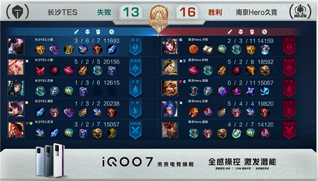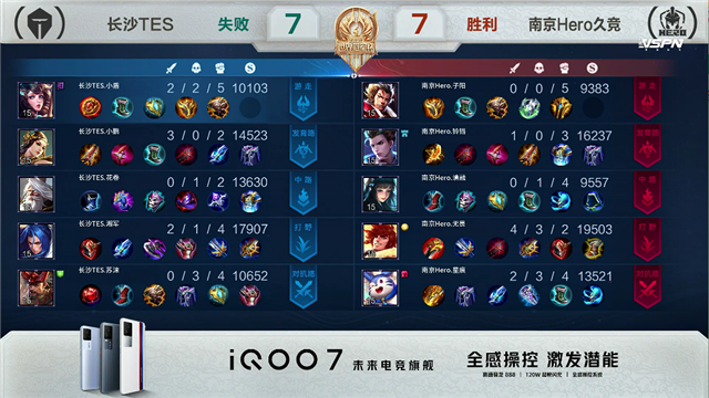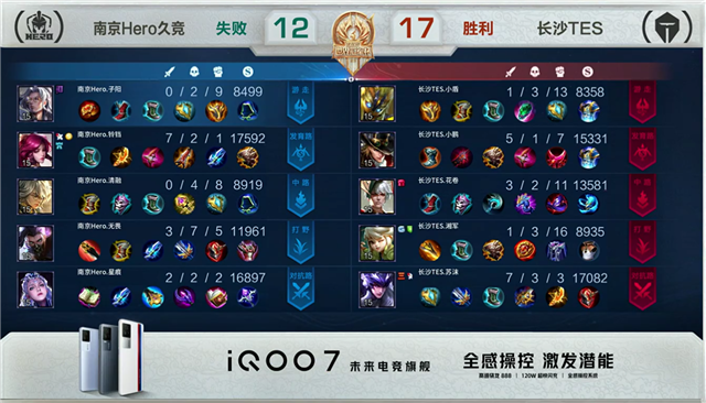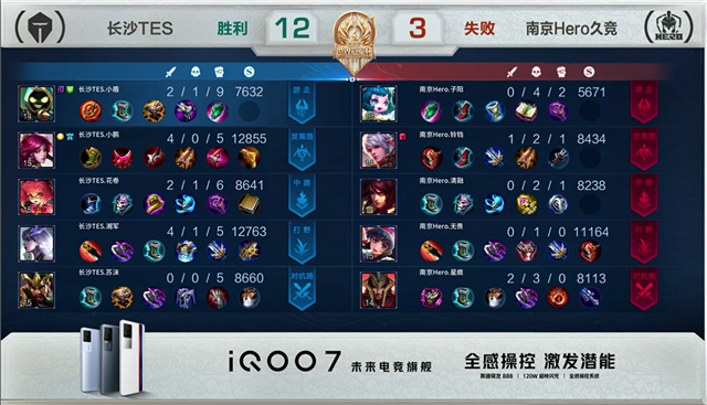 2分06秒,上路团,长沙TES打出1换2。3分55秒,南京Hero拿下先知主宰。5分58秒,长沙TES拿下暴君。6分50秒,长沙TES击杀西施并破掉南京Hero上一塔。10分20秒,长沙TES上路击杀裴擒虎。11分02秒,南京Hero拿下暗影暴君。11分58秒,南京Hero破掉长沙TES上二塔,长沙TES破掉南京Hero下二塔。12分20秒,南京Hero拿下暗影主宰。13分03秒,南京Hero接连破掉长沙TES下、中二塔,随后上路击杀大乔。13分40秒,南京Hero破掉长沙TES上高地。14分03秒,南京Hero破掉长沙TES中高地。14分36秒,南京Hero击杀廉颇。15分16秒,南京Hero拿下暗影暴君。15分47秒,长沙TES击杀梦奇。17分06秒,南京Hero控下暗影主宰。18分钟,长沙TES击杀裴擒虎。20分50秒,长沙TES拿下风暴龙王并击杀梦奇。21分28秒,长沙TES破掉南京Hero上高地及中二塔。22分12秒,长沙TES破掉南京Hero中高地。23分10秒,双方团,南京Hero打出0换4。23分28秒,南京Hero摧毁长沙TES水晶赢下比赛。