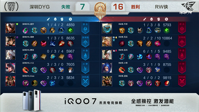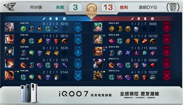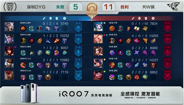 2分02秒,RW侠后羿大招开团打出1换2。2分28秒,深圳DYG拿下暴君。3分17秒,RW侠关羽击杀娜可露露。4分46秒,深圳DYG野区反打击杀盾山。5分02秒,深圳DYG娜可露露击杀嬴政。5分20秒,深圳DYG下路击杀后羿。6分35秒,野区团,RW侠打出2换3,随后破掉深圳DYG中一塔。7分37秒,双方团,RW侠击杀夏侯惇。8分37秒,RW侠上路打出1换2。9分08秒,RW侠破掉深圳DYG上二塔。9分42秒,RW侠拿下先知主宰。10分48秒,RW侠拿下暗影暴君,随后再控下暗影主宰。11分43秒,RW侠后羿大招定住姜子牙将其击杀。12分17秒,RW侠破掉深圳DYG中二塔。12分40秒,RW侠连续破掉深圳DYG三座高地。12分55秒,RW侠一波摧毁深圳DYG水晶赢下比赛!