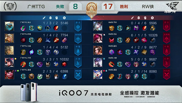 镜拿下一分钟中路河道之灵。1分50秒老夫子拿下一血。2分18秒沈梦溪被击杀。2分29秒赵云拿下暴君。2分50秒镜拿下主宰。3分40秒RW侠集火下路,虞姬和太乙真人被击杀。4分钟广州TTG下路一塔被破。5分10秒广州TTG入侵野区,太乙真人被击杀。6分30秒周瑜推掉中路一塔。6分48秒镜拿下暴君。7分钟赵云被击杀。7分21秒镜拿下主宰。8分18秒中路团战,双方2换2。9分钟野区团战,镜拿下双杀。10分10秒镜拿下暴君。11分20秒镜拿下主宰。11分39秒广州TTG推掉上路二塔。13分20秒广州TTG推掉中路高地塔。广州TTG顺势强攻水晶。13分41秒广州TTG推掉水晶追平比分。