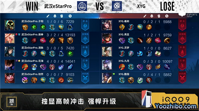 双方常规开局。1分15秒XYG对抗路击杀马超拿到一血。2分23秒XYG拿下暴君。2分42秒XYG中路击杀钟无艳。3分34秒双方对抗路1换1。4分45秒武汉eStar拿下主宰。5分48秒XYG野区击杀钟无艳。6分30秒XYG拿下暴君。9分09秒XYG拿下主宰。10分20秒发育路团战XYG打出1换2。10分41秒XYG野区击杀阿古朵。10分52秒XYG拿下暗影主宰。11分06秒XYG摧毁敌方中路外塔。12分22秒XYG拿下暗影暴君。12分54秒XYG摧毁敌方对抗路二塔。14分42秒XYG拿下暗影主宰。15分46秒高地团战XYG打出2换3摧毁敌方水晶拿下比赛。