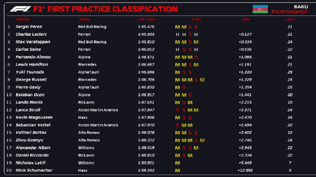 24直播网讯 2022年F1阿塞拜疆大奖赛第1次练习赛在巴库赛道结束,去年的阿塞拜疆大奖赛冠军得主佩雷兹以1:45.476排名第一,勒克莱尔落后0.127秒排名第二,维斯塔潘落后0.334秒排名第三,塞恩斯和阿隆索分列四五。排名六至十位的车手分别是汉密尔顿、角田裕毅、拉塞尔、加斯利、奥康。