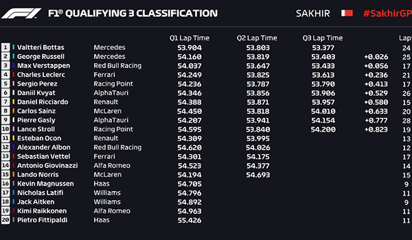 最后一圈的争夺,博塔斯没有能够提升自己的成绩,拉塞尔略微提升了自己的成绩,但是依然不足以超越自己的队友,维斯塔潘同样没有超越博塔斯,这样博塔斯就顺利拿下了本站比赛的杆位,拉塞尔排名第二位。维斯塔潘第三,接下来依次是勒克莱尔、佩雷兹和科维亚特。F1萨基尔大奖赛排位赛成绩表: