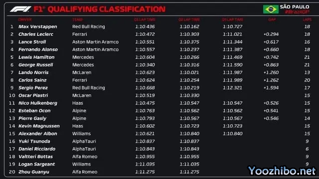 24直播网讯 北京时间11月4日,2023赛季F1巴西大奖赛结束了排位赛的争夺。由于排位赛Q3阶段突如其来的暴雨,维斯塔潘仅跑一圈就拿下杆位,勒克莱尔第二,斯托尔第三,阿隆索第四,中国车手周冠宇仅排名第20。