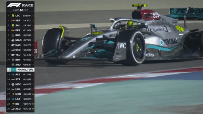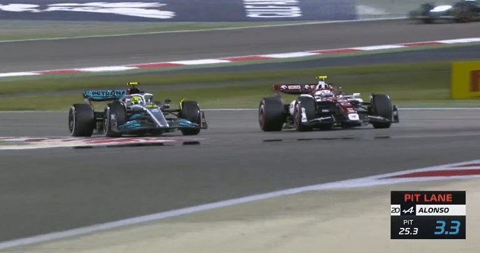 经典镜头来袭,当第12圈的时候,汉密尔顿完成换胎,周冠宇完成了对于汉密尔顿的超越,来到第12名。不过很快,在一号弯直线,汉密尔顿夺回位置。随后周冠宇16圈的时候进站,出站到了18名。