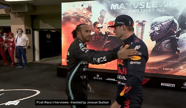 这场比赛结束之后,被绝杀的汉密尔顿大气十足,他与冠军维斯塔潘握手致意,祝贺对方获得了总冠军。而汉密尔顿非常可惜,他由于错过了进站入口没有选择进站,没有更换更换了软胎,被维斯塔潘绝杀。