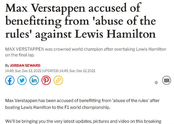 作为汉密尔顿的“老东家”英国媒体对于这场比赛感到非常不满意,他们在赛后第一时间就进行了报道,针对这场刚刚结束的F1收官战,英国媒体怒斥:“获得冠军的维斯塔潘被指受益于‘滥用规则’”。不管最终的结果怎么样,这样的结果不会让车手之间彼此怨恨”