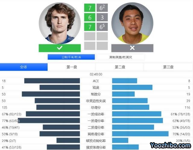 首盘兹维列夫在第2局挽救2个破发点,第9局中岛布兰登化解破发点保发,双方前12局各保发球局,比赛进入抢七。抢七局2-2之后兹维列夫连得5分,7-2赢下首盘抢七。