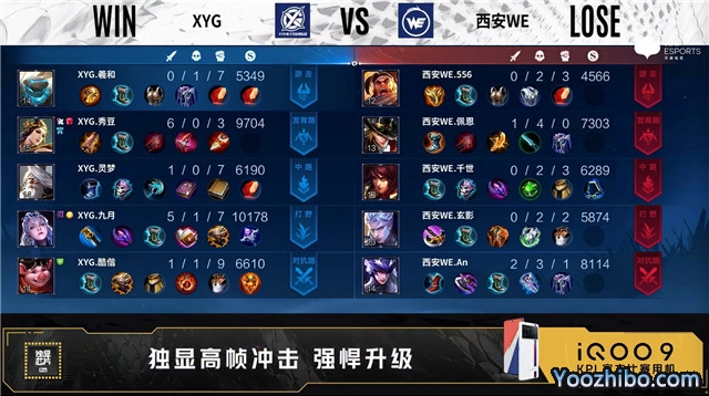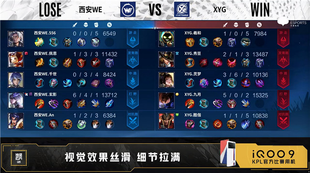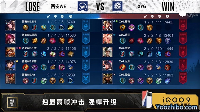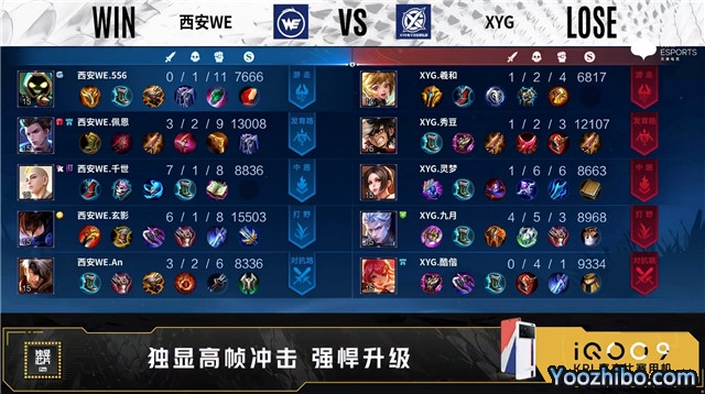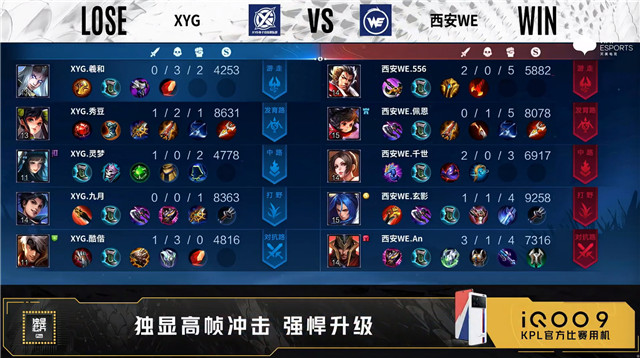 开局XYG公孙离中路抢线。3分22秒西安WE拿下暴君。3分45秒西安WE主宰处击杀娜可露露。5分41秒发育路团战XYG打出1换4。7分31秒XYG拿下暴君。8分06秒西安WE野区击杀张飞。8分54秒野区团战XYG打出0换2。10分56秒西安WE拿下暗影暴君并在中路击杀公孙离。12分24秒XYG摧毁敌方中路外塔。12分48秒中路团战XYG打出1换2。14分15秒XYG拿下暗影主宰。15分24秒高地前团战XYG打出1换2。17分38秒发育路团战XYG打出1换3。18分22秒XYG摧毁敌方水晶拿下比赛。