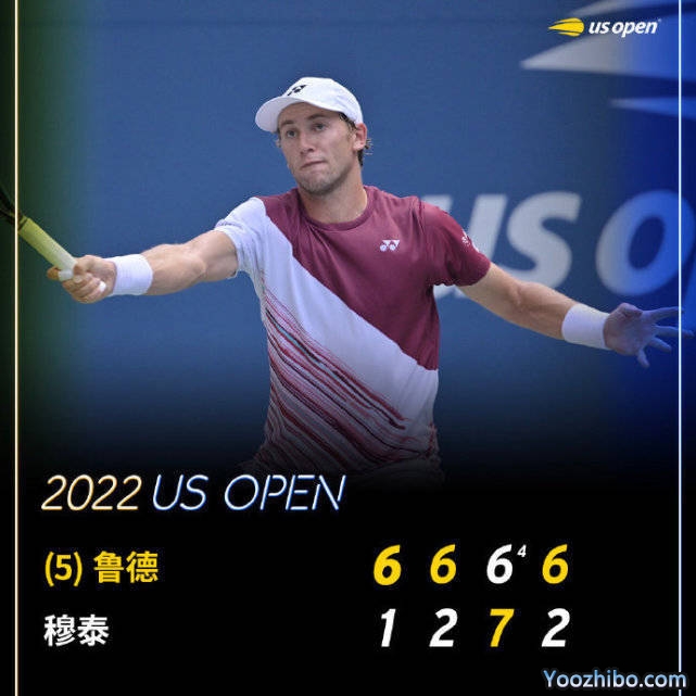 第三盘鲁德在第6局破掉对方发球局,第8局穆泰破发追至4平。此后两人各自保发,比赛进入抢七。抢七局穆泰更胜一筹,7-4赢下抢七追回一盘。第四盘鲁德第4局破发取得3-1的优势,第5局他挽救2个破发点保发。第8局鲁德在对手全场没有退路的一局再次破发,6-2赢下第四盘。最终在一场耗时3小时20分钟的比赛当中,赛会5号种子鲁德以6-1/6-2/6(4)-7/6-2战胜了黑马穆泰,成功跻身美网男单八强。这是鲁德继今年法网之后再次闯入大满贯八强,也是他生涯首次硬地大满贯八强。接下来鲁德将会同贝雷蒂尼相遇,争夺一个四强席位。