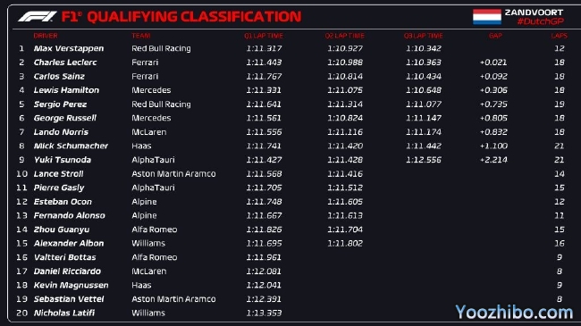 24直播网讯 2022年F1荷兰大奖赛排位赛在赞德沃特赛道结束,红牛车队维斯塔潘在主场拿到杆位,这也是他连续两年在主场拿到杆位;法拉利车队勒克莱尔第二,他的队友塞恩斯第三。汉密尔顿、佩雷兹、拉塞尔、诺里斯、米克-舒马赫、角田裕毅、斯托尔分列四至十位。中国车手周冠宇排名第14位。