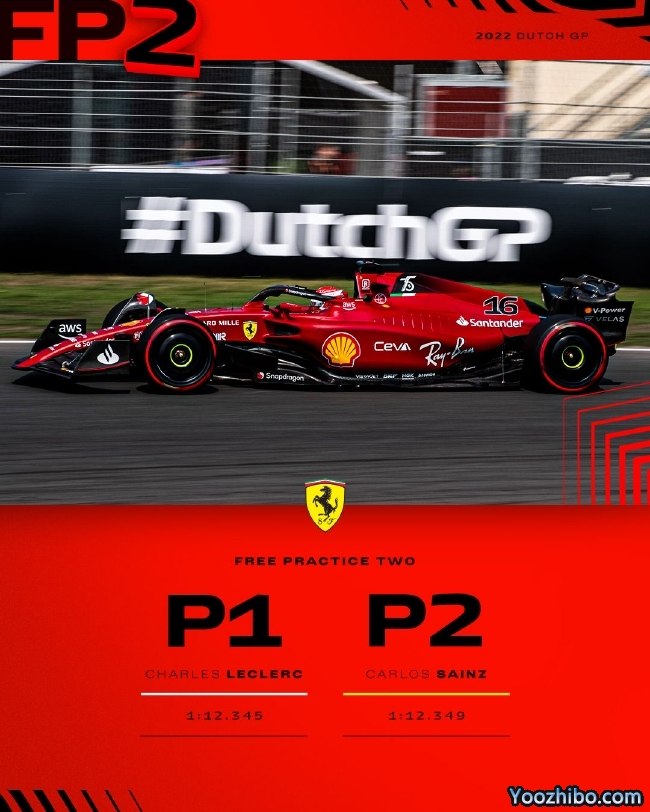 24直播网讯 2022年F1荷兰大奖赛第2次练习赛9月2日晚结束,法拉利车队夏尔·勒克莱尔以1分12秒345的成绩排名第一,队友塞恩斯仅落后0.004秒位居第二,汉密尔顿第三。诺里斯、拉塞尔、斯托尔、阿隆索、维斯塔潘、奥康、里卡多分列四至十位。中国车手周冠宇圈速排名第15位。