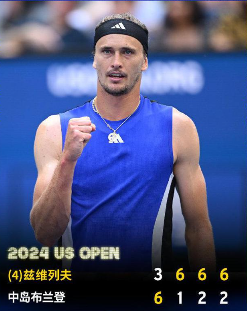 24直播网讯 2024年美网男单第四轮,赛会4号种子、德国名将兹维列夫克服先丢一盘的不利局面,连扳三盘,耗时2小时36分钟以3-6、6-1、6-2、6-2逆转世界排名第50位的美国选手中岛布兰登,连续两年晋级美网男单八强2。以下是具体的比赛过程: