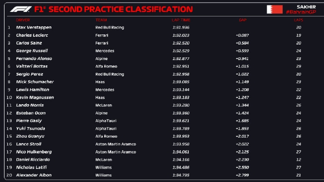 2022F1巴林大奖赛第一次练习赛成绩表: