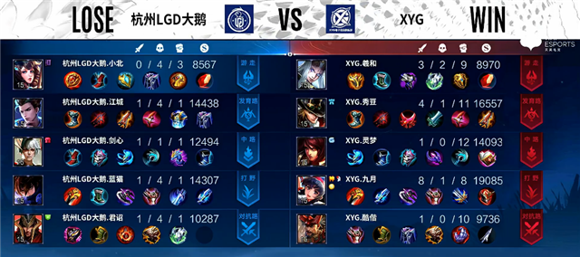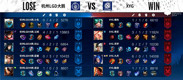 2分40秒下路团战,沈梦溪拿下一血。3分40秒不知火舞抢下暴君。4分50秒下路团战,张良被击杀。5分10秒下路团战,双方1换1。5分40秒狄仁杰推掉下路一塔。5分50秒露娜拿下主宰。6分30秒中路团战,XYG打出2换3。8分04秒孙尚香推掉上路一塔。8分10秒暴君团,露娜拿下暴君,杭州LGD大鹅打出1换2。8分40秒露娜推掉中路一塔。10分20秒露娜拿下主宰,阿古朵拿下暴君。12分钟杭州LGD大鹅推掉上路高地塔。13分钟杭州LGD大鹅推掉中路高地塔。14分钟露娜拿下暴君,阿古朵被击杀。14分40秒高地团战,孙尚香拿下三杀。14分46秒杭州LGD大鹅推掉水晶追回一分。