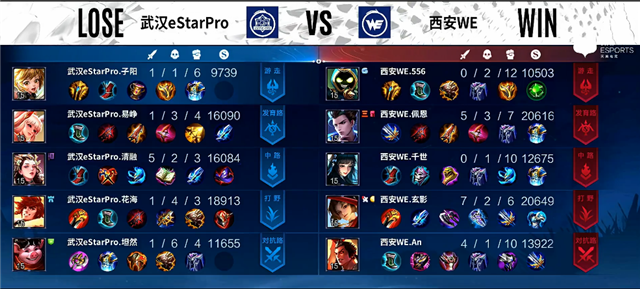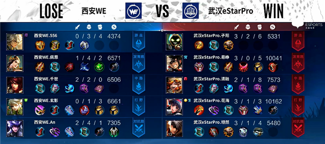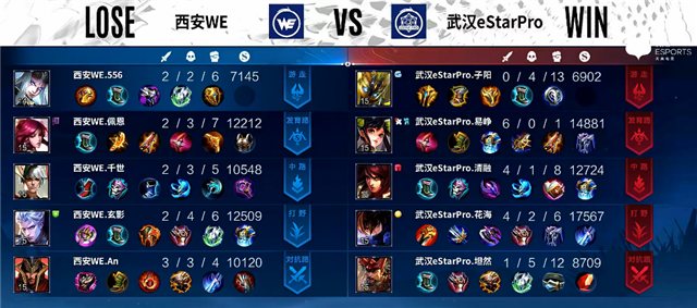开局武汉eStarPro入侵野区,蒙恬拿下一血,双方1换1。2分钟上路团战,武汉eStarPro打出1换2。3分11秒澜拿下暴君。4分20秒下路团战,东皇太一被击杀。4分55秒澜拿下主宰。5分12秒孙尚香推掉下路一塔。6分10秒中路团战,双方1换1。7分20秒中路团战,伽罗被击杀。7分40秒澜拿下暴君。9分21秒孙尚香推掉中路一塔。9分47秒澜拿下主宰。13分20秒高地团战,武汉eStarPro打出1换2,孙尚香推掉上路高地塔。14分20秒澜拿下主宰。15分20秒高地团战,双方1换1,孙尚香推掉中路高地塔。16分14秒澜拿下暴君。17分钟高地团战,西安WE打出1换3,孙尚香推掉下路高地塔。18分20秒孙尚香抢下主宰。19分16秒武汉eStarPro推掉水晶拿下本场比赛胜利。