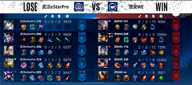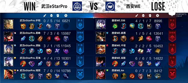 2分20秒上路团战,吕布拿下一血。3分钟镜拿下暴君。3分55秒澜拿下主宰。4分10秒主宰团,武汉eStarPro打出0换2。5分钟河道团战,武汉eStarPro打出0换2。5分24秒澜推掉下路一塔。7分钟镜被击杀。8分钟澜拿下暴君。8分10秒下路团战,武汉eStarPro打出2换3。9分17秒镜拿下主宰。9分40秒下路团战,西安WE打出0换2。10分钟马可波罗推掉中路一塔。10分17秒澜拿下暴君。10分30秒中路团战,西安WE打出0换2。11分26秒澜拿下主宰,团战双方3换3。12分40秒上路团战,武汉eStarPro打出0换2。14分20秒镜拿下暴君,团战武汉eStarPro打出1换3。14分59秒吕布推掉中路一塔。15分24秒镜拿下主宰。18分钟镜拿下暴君。19分钟上路团战,武汉eStarPro打出1换5团灭西安WE。20分钟武汉eStarPro推掉水晶追回一分。